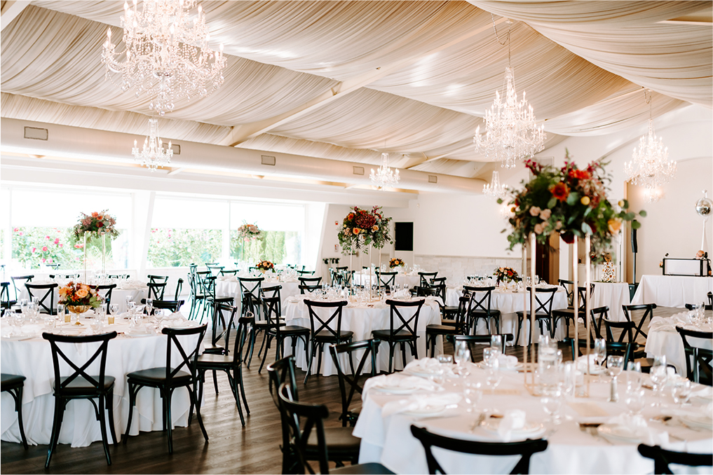 Located next to the mansion, the Pavilion at Meson Sabika is a separate building fully enclosed in large plate glass windows that can host parties of up to 300 guests for a seated meal. The lushly landscaped grounds are fully visible from the towering windows that make up three sides of the venue. After being greeted by an ethereal cloud ceiling in the foyer, you will enter the main room where eleven cut crystal chandeliers grace the ceiling elegantly dressed with creamy sheer fabric.